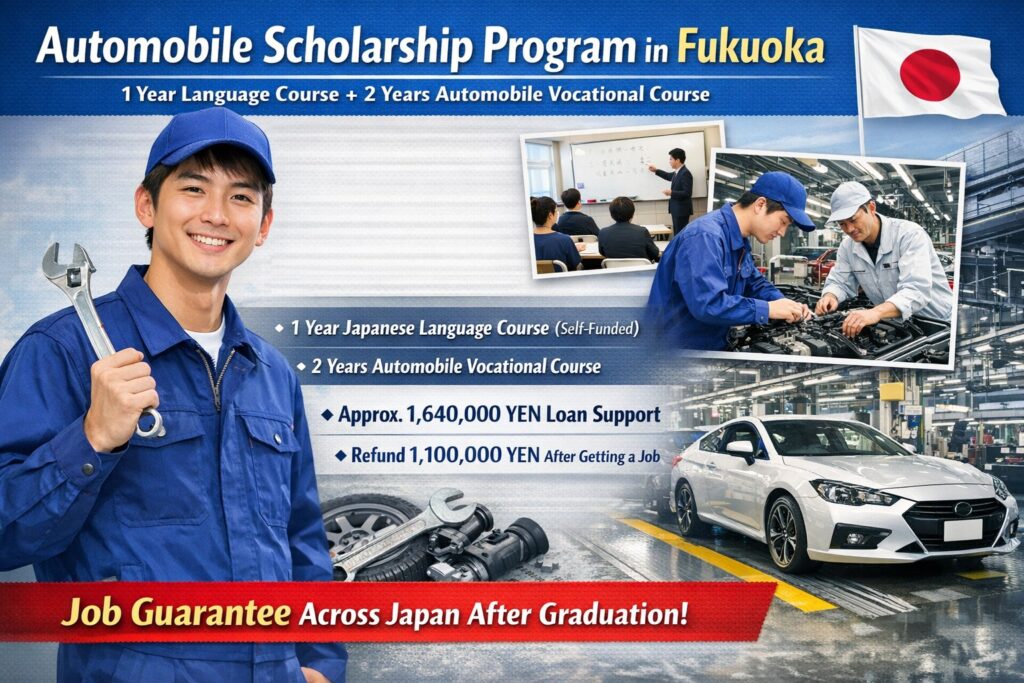 • Option 2 (Partial Scholarship): Self-fund your 1-year Japanese language course and receive a full scholarship (approx. 2,000,000 YEN, no refund required) for the 2-year vocational course.