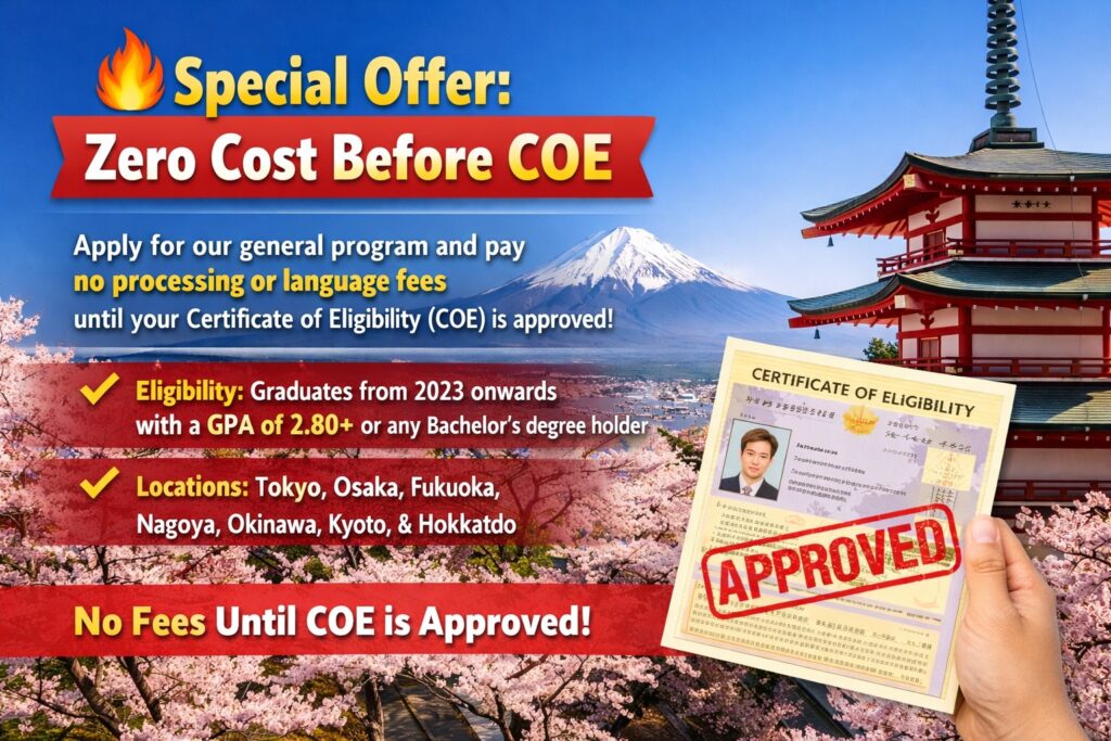 Apply for our general program and pay no processing or language fees (N5) until your Certificate of Eligibility (COE) is approved!